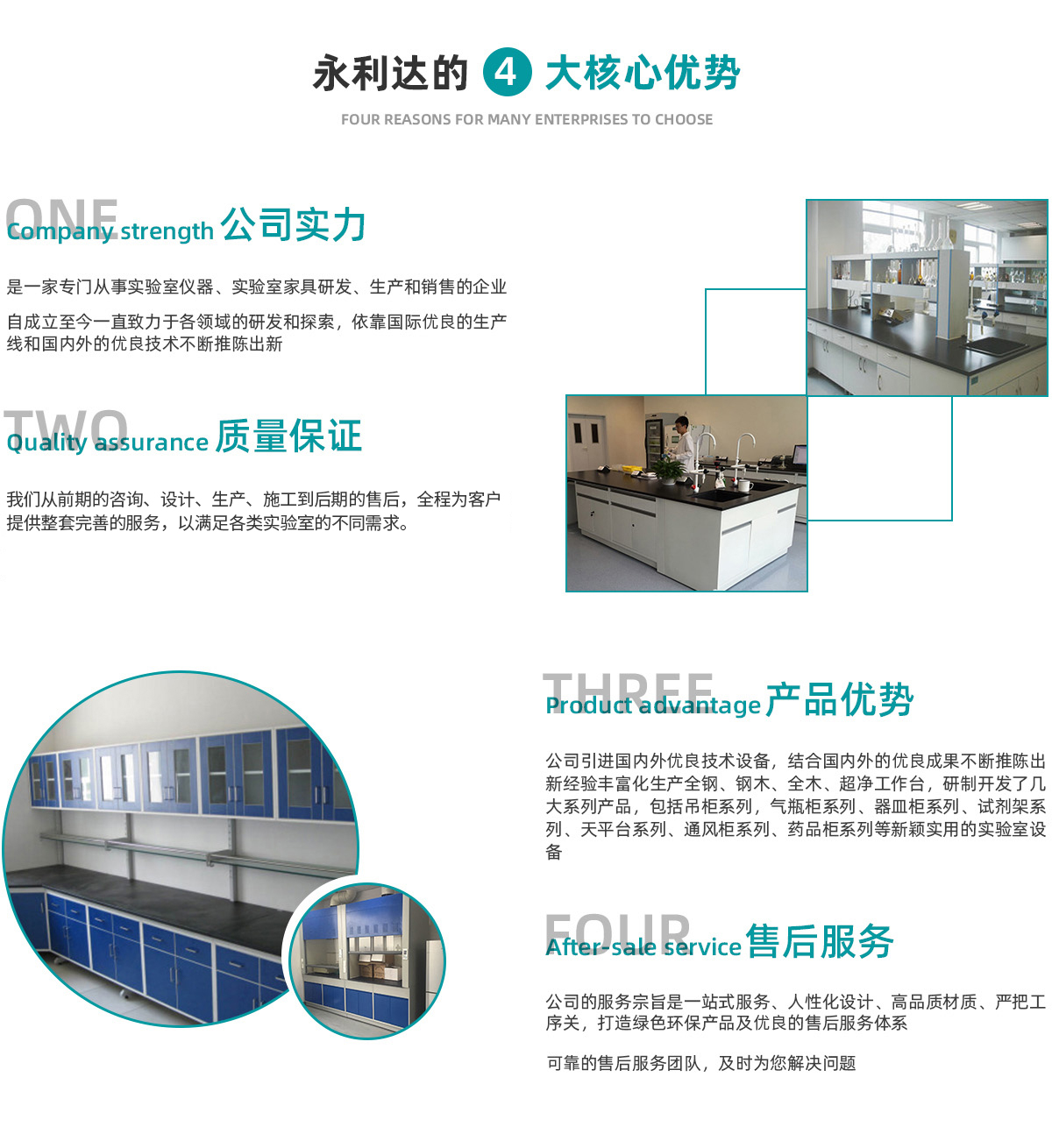 天津永利達(dá)實驗室設(shè)備有限公司是一家從事實驗室家具研發(fā)、生 產(chǎn)、銷售與服務(wù)于一體的企業(yè)。成立于2006年,坐落于天津市靜海高新產(chǎn)業(yè)園區(qū)。公司秉承“科技創(chuàng)新、質(zhì)量為本、服務(wù)至上”的理念,致力于為用戶提供實驗室家具和整體解決方案。 公司的主要業(yè)務(wù)涵蓋了實驗室家具、實驗室通風(fēng)、凈化、集中供氣、純水及裝修等多個領(lǐng)域,憑借多年在實驗室行業(yè)的積累,和不斷吸收國際上的技術(shù)與設(shè)計理念,我們從前期的咨詢、設(shè)計、生產(chǎn)、施工到后期的售后,全程為客戶提供整套完善的服務(wù),以滿足各類實驗室的不同需求。 公司的服務(wù)宗旨是 提供人性化設(shè)計、材質(zhì)、嚴(yán)把工序關(guān),打造綠色環(huán)保產(chǎn)品及完善的售后服務(wù)體系。
